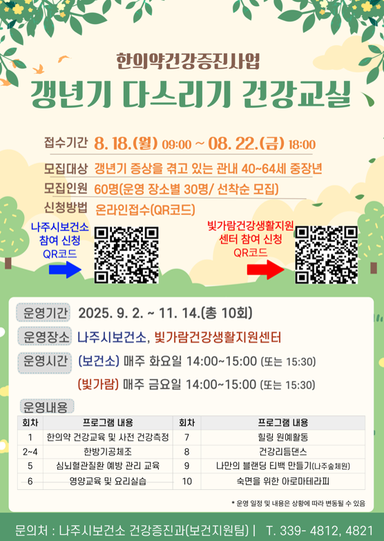 보건소와 빛가람건강생활지원센터는 9월 2일부터 11월 14일까지 10주간 총 10회에 걸쳐 프로그램을 진행하며, 관내 40~64세 중장년층 중 갱년기 증상을 겪는 주민을 대상으로 한다. 모집 인원은 운영 장소별 30명씩 총 60명이며, 신청은 8월 18일부터 22일까지 보건소 홈페이지를 통한 온라인 접수로 선착순 마감된다.