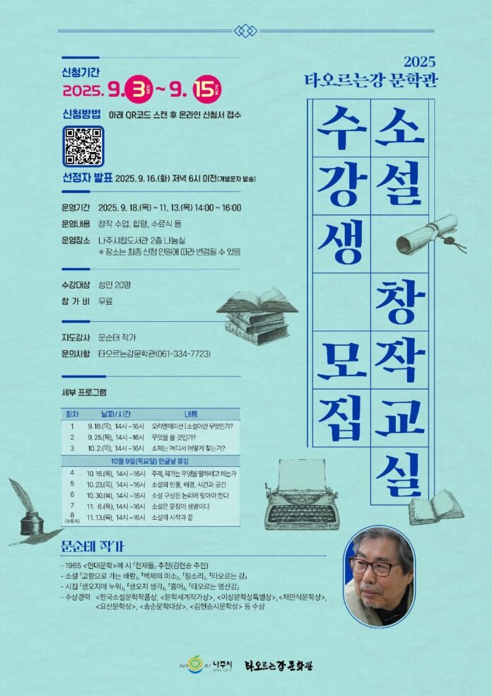 나주시 ‘타오르는강문학관’은 오는 9월 18일부터 11월 13일까지 8주간 진행되는 ‘2025 소설창작교실’ 수강생을 모집한다고 3일 밝혔다.
