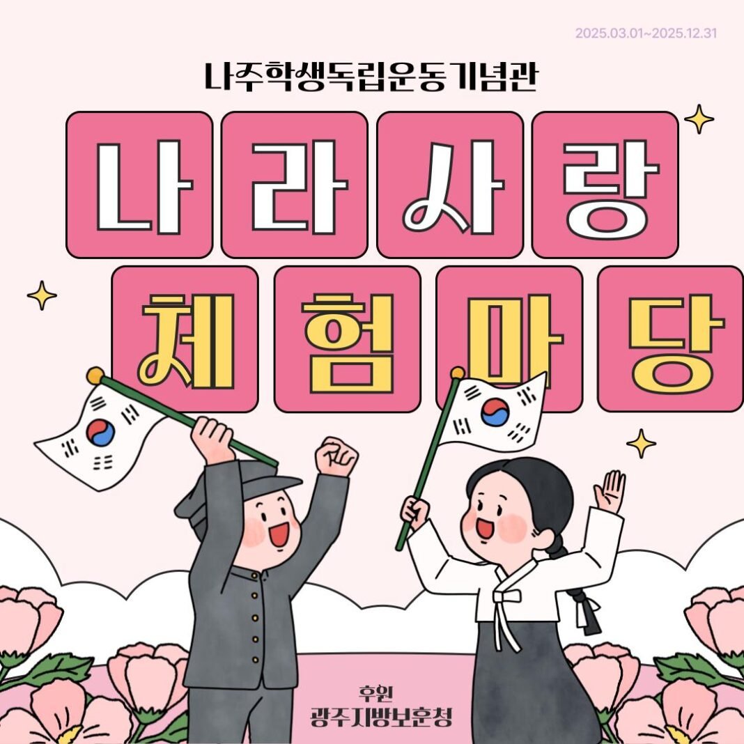 나주학생독립운동기념관(관장 박경중)은 광주지방보훈청 후원으로 진행 중인 ‘나라사랑 체험마당’ 프로그램을 오는 12월 31일까지 운영한다고 밝혔다.