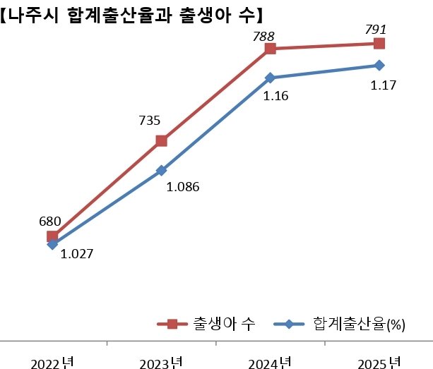 12일 나주시에 따르면, 2025년 나주시의 합계출산율은 1.17을 기록했다. 이는 전국 평균 0.8을 크게 웃도는 수치로, 2022년 1.027 이후 3년 연속 상승세를 이어가고 있다. 실제 출생아 수 역시 2022년 680명에서 2025년 791명으로 꾸준히 늘며 지역 인구 활력의 청신호를 밝히고 있다.