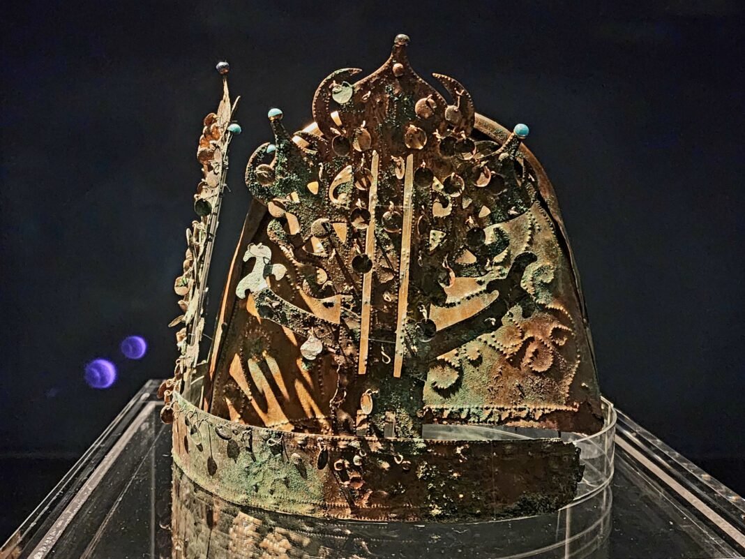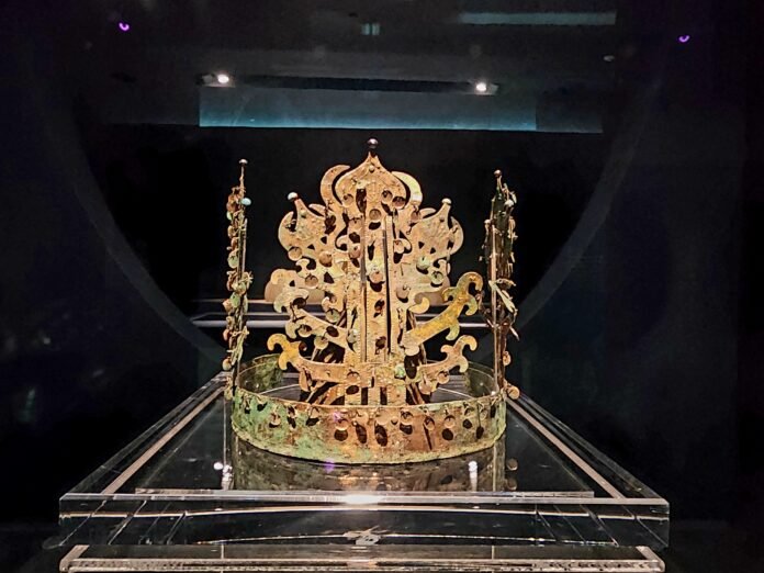 금동관은 얇은 동판을 이용해 제작된 관모로, 외관과 내관이 분리된 이중 구조를 이루고 있다. 외관은 머리띠 형태 위에 초화형 장식을 세운 구조로, 정교한 문양과 장식성이 돋보인다. 내관은 반원형 동판을 결합해 만들어 실제 착용이 가능하도록 구성되어 있다. 형태적으로는 신라 금관과 유사하나, 자연스러운 초화형 장식이 사용되어 보다 이른 시기의 양식을 보여주는 것으로 평가된다.
