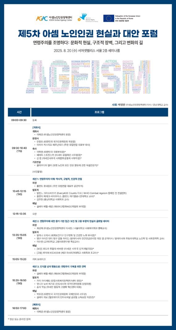 아셈노인인권정책센터(AGAC)는 국가인권위원회·주한유럽연합대표부와 공동으로 오는 8월 20일 서머셋팰리스 서울에서 ‘연령주의를 조명하다: 문화적 현실, 구조적 장벽, 그리고 변화의 길’을 주제로 ‘제5차 아셈노인인권 현실과 대안’ 포럼을 개최한다.