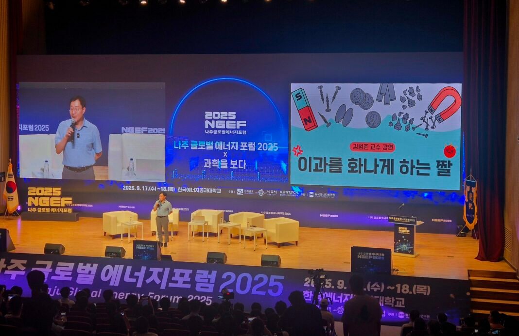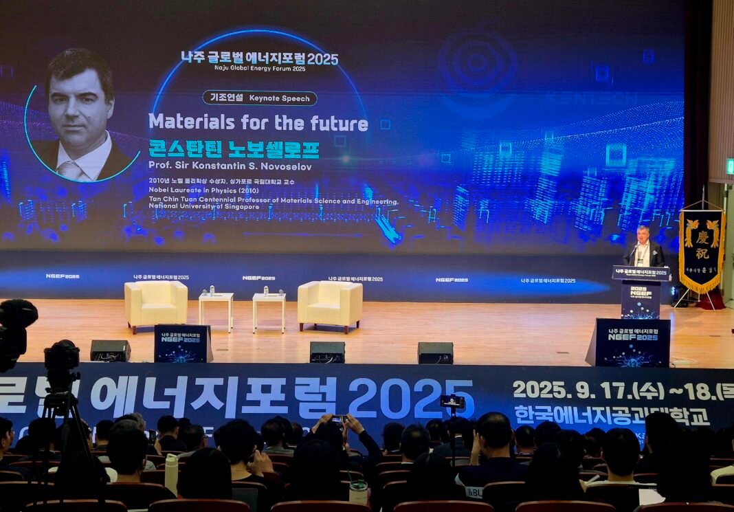 나주시는 17일부터 18일까지 이틀간 ‘한국에너지공과대학교’에서 ‘나주 글로벌 에너지포럼 2025’를 개최했다. 이번 포럼에는 2010년 노벨물리학상 수상자인 ‘콘스탄틴 노보셀로프’ 싱가포르국립대 교수가 기조연설자로 참여해 관심을 모았다.