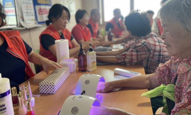 어르신들이 네일 및 손마사지 서비스를 받고 있다. 사진=한장숙