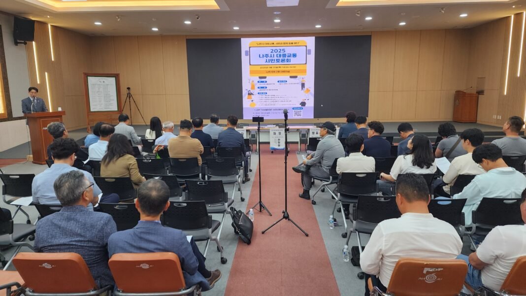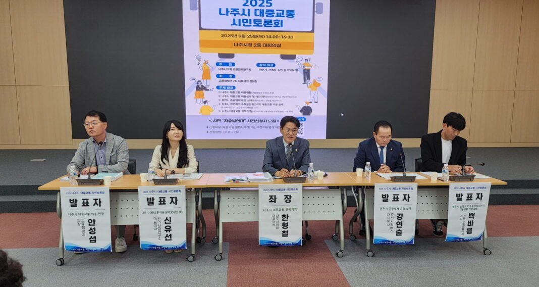 나주시의회 교통정책연구회(대표의원 한형철)가 9월 25일 나주시청 대회의실에서 대중교통 시민토론회를 열고 주민들의 목소리에 귀 기울였다.