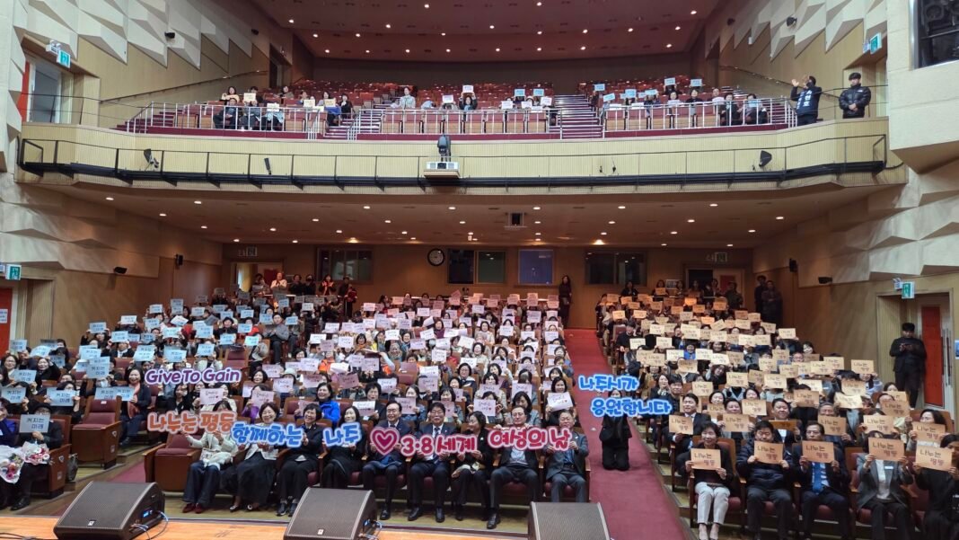 제118주년 세계여성의날 기념행사가 여성단체회원과 시민, 공직자 등 500여명이 참석한 가운데 카드섹션과 함께 성황리에 개최됐다. 사진=안행자