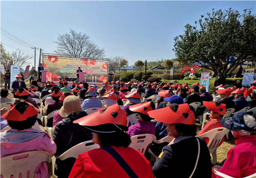 동백꽃 모양의 빨간 모자를 쓴 참석자들이 제2회 금사정 동백축제 개막식을 가득 메우며 축제 열기를 더하고 있다.사진=김동애