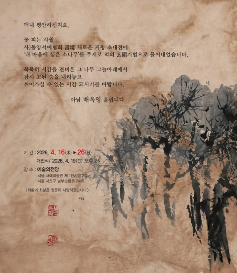 또한 2006년부터 한자한문교사중앙연수원에서 매주 토요일 동양철학과 서예·동양화 강의를 이어오고 있으며, 방송을 통해 ‘다산에게 배우는 삶의 지혜’ 등 인문학의 대중화에도 기여하고 있다. 배 작가는 초대장을 통해 “묵묵히 시간을 견뎌온 그 나무 그늘 아래에서 잠시 고된 숨을 내려놓고 쉬어가실 수 있는 시간이 되길 바란다”고 소회를 전했다.