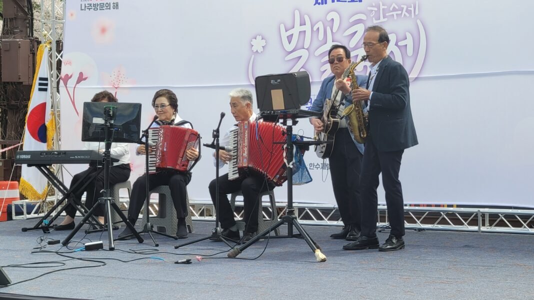 식전행사로 무대에 오른 나주시립합창단이 ‘아름다운 나라’를 열창하며 분위기를 끌어올린 데 이어, ‘소리하모니악단’이 전자올갠·아코디언·색소폰·전자기타로 잔잔한 울림을 더했다. 이날 공연의 압권은 금남동 라틴댄스팀이었다. 차차차와 자이브를 선보인 무대에 관객들이 열렬히 호응하며 카메라 셔터를 연신 눌렀다.