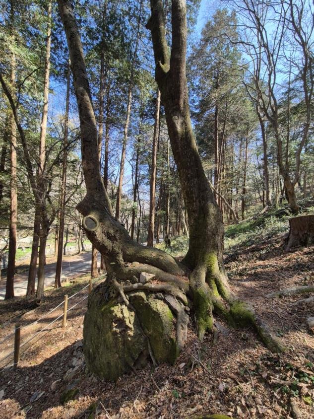 숲길을 따라 걷다 보면 왼쪽 언저리에 일명 사랑의 나무, 수령 600여년의 느티나무로 천년에 한 번 나올까 하는 음양수인 연리목은 큰 나무뿌리 밑에서 자라난 두 나무가 바위 위에 누워 한 몸이 되었고, 한 몸이 된 나무는 2004년 보호수로 지정되었다.